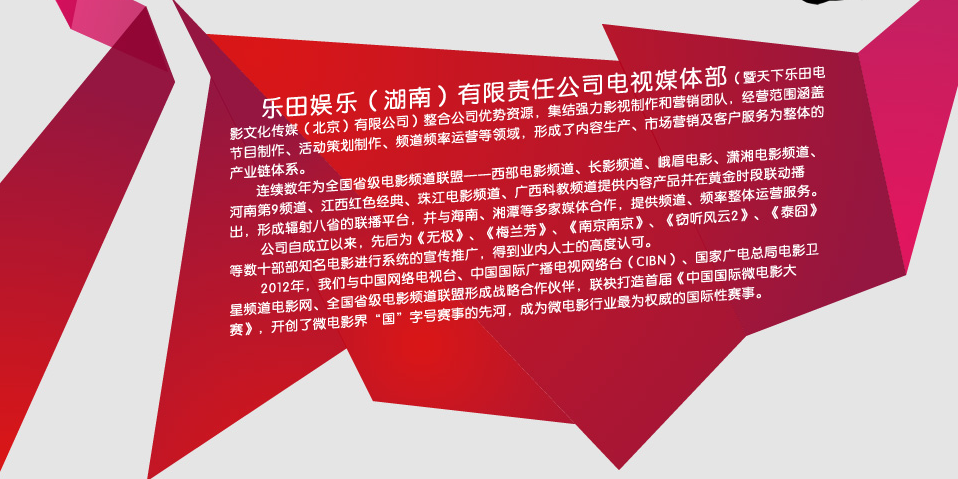 樂田娛樂(湖南)有限責(zé)任公司電視媒體部(暨天下樂田電影文化傳媒(北京)有限公司)整合公司優(yōu)勢(shì)資源,集結(jié)強(qiáng)力影視制作和營(yíng)銷團(tuán)隊(duì),經(jīng)營(yíng)范圍涵蓋節(jié)目制作、活動(dòng)策劃制作、頻道頻率運(yùn)營(yíng)等領(lǐng)域,形成了內(nèi)容生產(chǎn)、市場(chǎng)營(yíng)銷及客戶服務(wù)為整體的產(chǎn)業(yè)鏈體系。