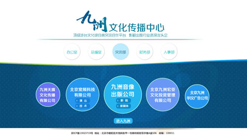 中心下屬及合資公司包括九洲音像出版公司、北京九洲宏亞文化投資管理有限公司、北京寬頻科技有限公司、九洲華漢廣告公司。其中九洲音像出版公司成立于1993年,注冊資金1000萬元,為國有綜合性文化經(jīng)營企業(yè),為國內(nèi)第一批獲得政府認證的(甲種)《電視劇制作許可證》的影視制作機構。主營業(yè)務包括影視、音像作品的編輯、制作、攝制、出版、發(fā)行、放映,影視、音像版權貿(mào)易,大型演出、展覽和兩岸交流活動,以及與主營業(yè)務相關的技術開發(fā)、信息咨詢與服務等。 20多年來,拍攝電影6部、電視劇70多部2300多集,各類專題片500多集,舉辦兩岸演出200多場,發(fā)行音像制品8000多個品種,產(chǎn)品覆蓋全國31個省區(qū)市及臺港澳和海外市場。代表作品有電視劇《天龍八部》、《射雕英雄傳》、《神雕俠侶》、《京華煙云》、《臺灣1895》、《原鄉(xiāng)》,紀錄片《臺北故宮》,電影《團圓》,音像制品《中國臺灣問題》、《臺灣童話系列》等。獲得包括“飛天獎”、“金鷹獎”、“五個一工程獎”、“星光獎”、“金唱片獎”以及“柏林電影節(jié)銀熊獎”、“加拿大電視節(jié)金美洲獎”等多個獎項。此外,公司向臺灣輸出電視劇近百部,排在大陸文化企業(yè)之首。2007-2010年度連續(xù)4年獲得商務部、文化部、廣電總局、新聞出版總署頒發(fā)的“國家文化出口重點企業(yè)”,以及“最具實力國營電視劇制作機構”、“十佳電視劇出品單位”、“兩岸交流優(yōu)秀電視機構”等稱號。