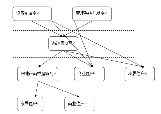 1)最上端是產(chǎn)品提供商,包括設(shè)備制造商和管理系統(tǒng)開發(fā)商,這兩者也很可能是一家公司。他們提供家居的基本產(chǎn)品,包括家電、數(shù)碼產(chǎn)品、網(wǎng)絡(luò)通信、安防設(shè)備,還包括窗簾控制等產(chǎn)品和相關(guān)的控制軟件系統(tǒng)。他們是整個產(chǎn)業(yè)的產(chǎn)品提供者。產(chǎn)品一般是通過下級的系統(tǒng)集成商進(jìn)行代理,也有些相對獨立的產(chǎn)品可以直接銷售給終端用戶。