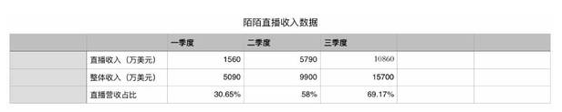 財報顯示,三季度陌陌直播業(yè)務(wù)產(chǎn)生營收1.086億美元,在整體收入中占比為69.17%,直播已經(jīng)成為當(dāng)之無愧的收入之王。由于陌陌直播業(yè)務(wù)在一年前才推出,還無法做同比分析,但環(huán)比增長卻十分可觀。直播業(yè)務(wù)在今年一季度首次被單獨拎出來統(tǒng)計,收入為1560萬美元收入,在整體營收占比為30.65%;二季度直播貢獻了5790萬美元收入,在整體營收中占比超過58%,這個季度陌陌直播又翻了近一倍(環(huán)比增長87.6%),勢頭很猛。當(dāng)直播收入占比已接近70%之時,我們完全可以認為陌陌已經(jīng)不再是一家基于LBS的位置社交公司,而是一家基于LBS的視頻社交平臺。