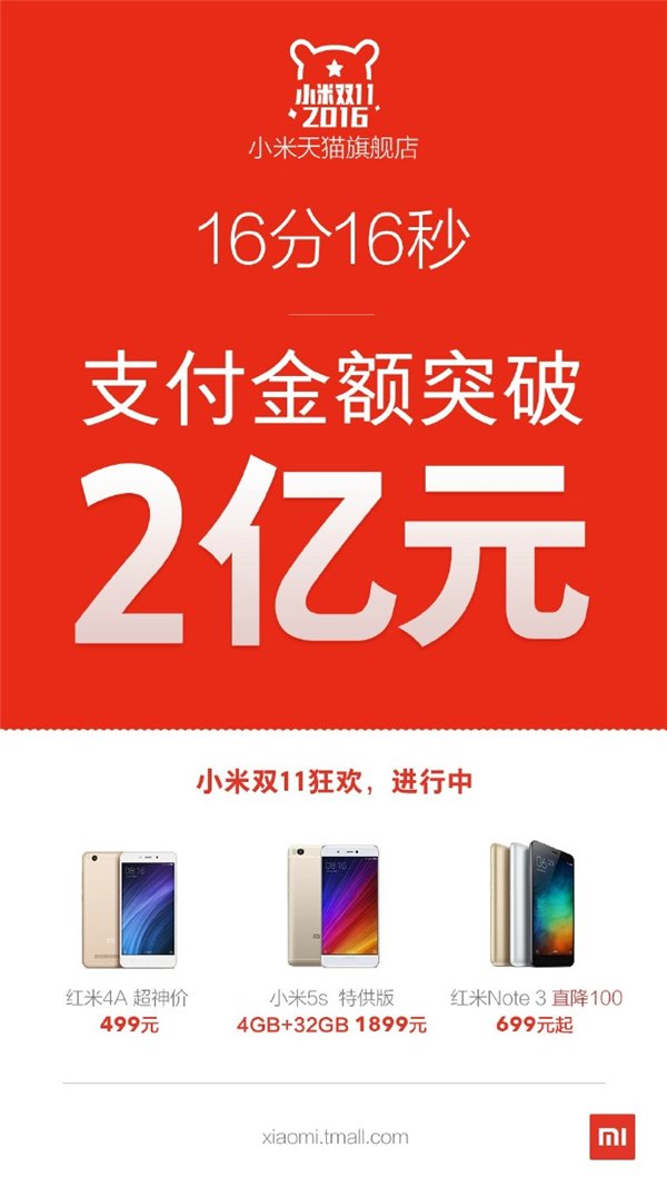 43、雙11戰(zhàn)報:小米天貓16分16秒破2億