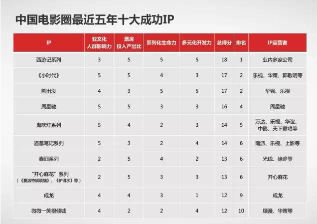 作為一名影視產(chǎn)業(yè)的參與者和觀察者,經(jīng)過半年的盤點(diǎn),并與多位業(yè)內(nèi)資深人士溝通,筆者做出了這樣一張榜單,從四個(gè)維度盤點(diǎn)了中國電影界最近五年運(yùn)營成功的十大IP。
