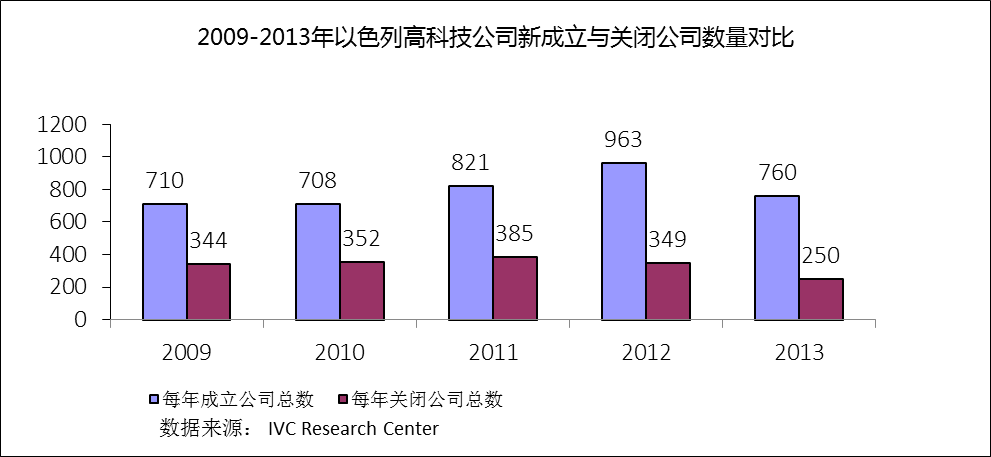 以色列“創(chuàng)業(yè)國度”的稱號,大概在創(chuàng)業(yè)圈里已不是新鮮事兒了。一組直觀的數(shù)據(jù)可以更好地說明。以色列IVC研究機構(gòu)今年發(fā)布數(shù)據(jù),自2009年以來每年以色列成立的創(chuàng)業(yè)公司數(shù)量急劇上升。對于一個人口只有八百萬的國家,僅相當于中國南京市人口,每年700多家創(chuàng)業(yè)公司成立是一件驚人的事情。與此同時,以色列每年關(guān)閉的初創(chuàng)公司數(shù)量從2011年起不斷減少,更多比例的創(chuàng)業(yè)公司在茁壯成長。
