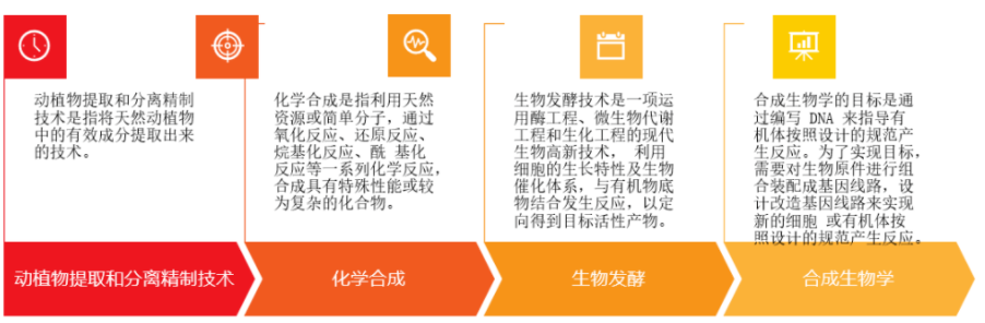 美妝行業(yè)原料有四大生產(chǎn)技術(shù)路徑,包括植物萃取、化學(xué)合成、生物發(fā)酵、合成生物。天然植物萃取技術(shù)和生物發(fā)酵技術(shù)是目前行業(yè)主流。