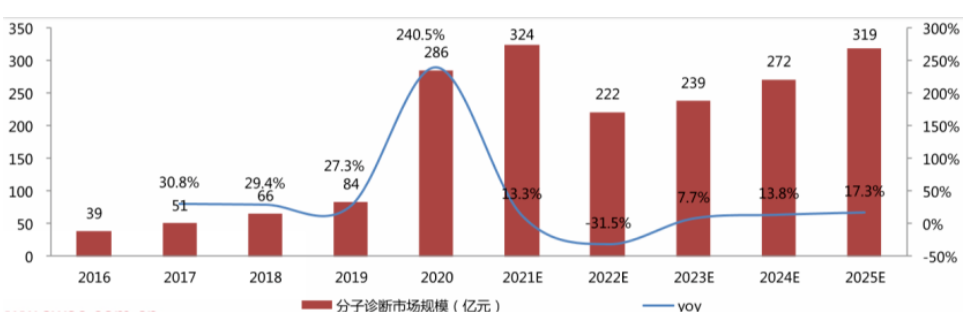 2020年,中國的核酸檢測市場規(guī)模已經(jīng)達(dá)到121億,且最近兩年仍在以18%左右的速度增長,預(yù)計到今年,將達(dá)到146億。