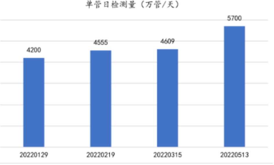 而在百億次檢測背后,國內(nèi)的檢測能力,也從2020年3月的126萬管/天,增至今年5月的5700萬管/天。