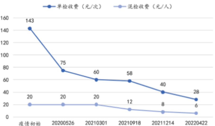 另一方面,今年4月1日,國家有關(guān)部門發(fā)布《關(guān)于降低新冠病毒核酸檢測價格和費用的通知》,要求下調(diào)公立醫(yī)療機構(gòu)新冠病毒核酸檢測的政府指導(dǎo)價。規(guī)定單人單檢降至不高于每人份28元;多人混檢統(tǒng)一降至每人份不高于8元。這已是全國第四輪核酸檢測降價。
