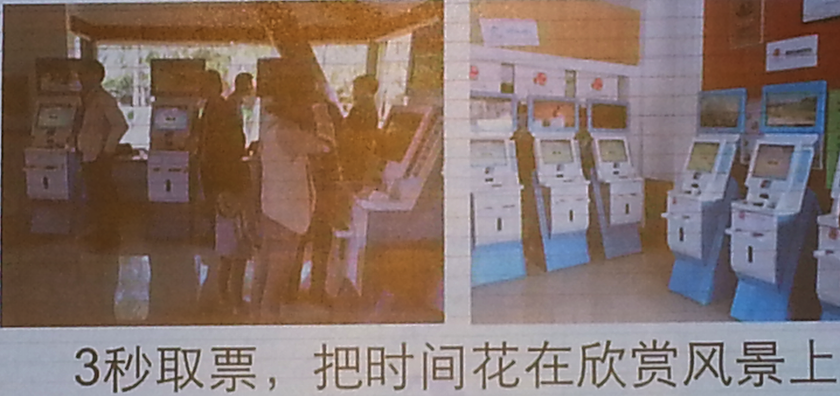 第四,在騰訊資金支持下同程嘗在景區(qū)布置類似高鐵車站取票、售票(接受現(xiàn)金及銀聯(lián)卡)一體機。