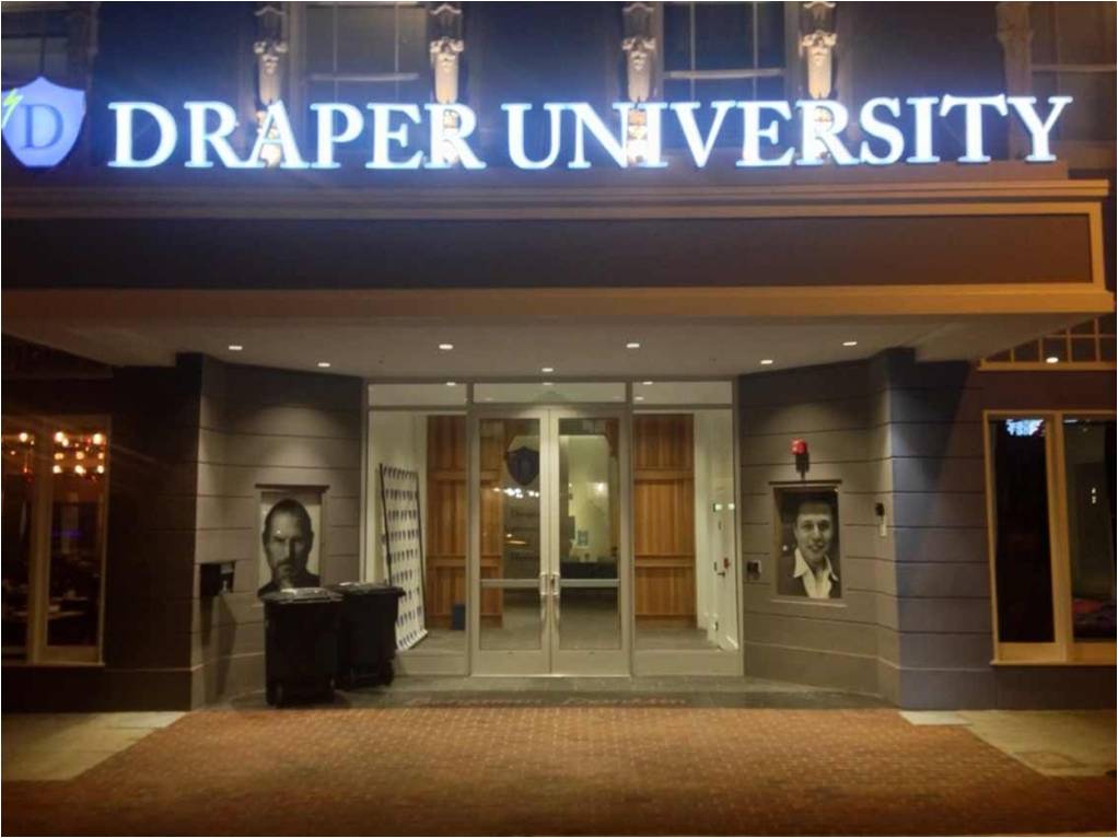Tim Draper是一個(gè)非常有名的投資家,他做了一個(gè)大學(xué)(DraperUniversity),這個(gè)大學(xué)是年輕人創(chuàng)業(yè)的培訓(xùn)和孵化中心。同在硅谷PayPal的聯(lián)合創(chuàng)始人Peter Thiel設(shè)立的基金甚至?xí)膭?lì)你從常規(guī)的大學(xué)里面輟學(xué)。我們知道歷史上最偉大的公司都是沒上完學(xué)這些人做出來的,不管比爾蓋茨、喬布斯還是扎克伯格,大學(xué)內(nèi)有一個(gè)創(chuàng)新基金專門鼓勵(lì)那些年輕的大學(xué)生輟學(xué)的,如果你有勇氣退學(xué)并且有一個(gè)好的創(chuàng)意,大學(xué)就有一筆好的錢資助你。大學(xué)的門口左邊是喬布斯,右邊是特斯拉的創(chuàng)始人Elon Musk的頭像。