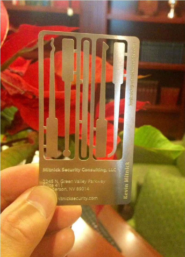 Kevin Mitnick這是世界頭號(hào)黑客,他是在歷史上非常傳奇的一個(gè)人物,他當(dāng)年被FBI被美國(guó)連邦調(diào)查局通緝的一個(gè)江洋大盜,那時(shí)候沒有現(xiàn)在的互聯(lián)網(wǎng),沒有現(xiàn)在的無線互聯(lián)網(wǎng)的移動(dòng)技術(shù),他搞黑客的活動(dòng)主要靠電話、靠上網(wǎng)的貓。看得出來這個(gè)名片是什么東西嗎?這是一個(gè)金屬的名片,這是一個(gè)撬鎖的工具,把上面的金屬片卸下來以后可以撬鎖。他雖然現(xiàn)在不做黑客了,他專門給很多的互聯(lián)網(wǎng)公司做系統(tǒng)安全的顧問,但是你可以看出來這個(gè)小子還是賊心不死,交換的名片都是一個(gè)撬鎖的工具。因?yàn)镵evin以前犯過罪,所以他被關(guān)起來的時(shí)候,當(dāng)時(shí)法律上禁止他出書的,法律要求一個(gè)人要經(jīng)過十年、五年之后才可以從自己的犯罪歷史中來謀取利益,所以他開始他換了一個(gè)角度寫了一本書《欺騙的藝術(shù)》,他被放出來以后寫了三本書,每一本都獲得了很大的成功。在Kevin Mitnick看來,互聯(lián)網(wǎng)的歷史上如果沒有黑客的精神,就不會(huì)有互聯(lián)網(wǎng)的今天,縱觀互聯(lián)網(wǎng)歷史的發(fā)展,不管是Facebook還是想比特幣這樣創(chuàng)新的東西,實(shí)際上都是靠我們黑客打破常規(guī)的精神去推動(dòng)的。