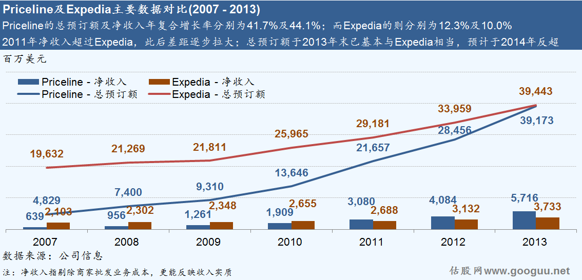 截止至2013年年末,總預訂額達391.73億美元,僅以微小差距落后于Expedia(394.43億美元),占全球旅游總花費約4%,排名第二,并預計于2014年全面超越Expedia;