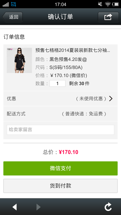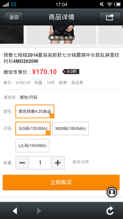 隨便挑了一件衣服進(jìn)入商品詳情頁,跟其他的微信商城沒什么區(qū)別。