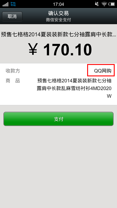 但仔細(xì)看了下支付確認(rèn)頁面就發(fā)現(xiàn)問題了!收款方不是七格格服飾公司,而QQ網(wǎng)購!原來有微信支付權(quán)限的不是七格格的公眾號(hào),而是QQ網(wǎng)購的公眾號(hào),也就是說所謂的訂閱號(hào)可以擁有微信支付接口根本不存在!