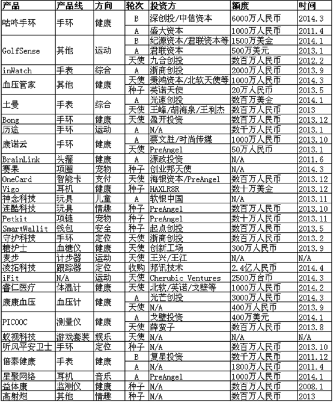 回到國內(nèi)可穿戴設(shè)備一級市場,按照公開數(shù)據(jù)顯示,在下游領(lǐng)域投資總共發(fā)生超過30起,輪次從種子到B輪都有,產(chǎn)品主要集中在手表、手環(huán),應(yīng)用領(lǐng)域集中在運(yùn)動、健康、醫(yī)療,跟蹤定位、寵物。綜合來看,A輪的投資額度多超過千萬,投資時間多發(fā)生在2013年,多數(shù)投資為天使/種子投資,最活躍的機(jī)構(gòu)當(dāng)屬PreAngel,其次有深創(chuàng)投、英諾天使等,看樣子是有意在布局。