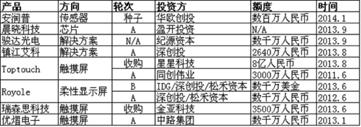 由于上市公司在技術(shù)和市場方面的相對壟斷,國內(nèi)上游產(chǎn)業(yè)在一級市場的表現(xiàn)相對不活躍,根據(jù)公開數(shù)據(jù)統(tǒng)計,總共發(fā)生8起投資事件,基本發(fā)生在2013年,最大投資來自星星科技8億收購觸摸屏廠商Toptouch,隨著可穿戴設(shè)備的不斷高速發(fā)展,上游產(chǎn)業(yè)也會出現(xiàn)更多擁有核心技術(shù)的創(chuàng)業(yè)公司。