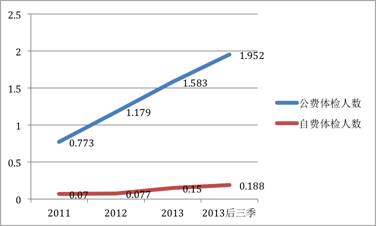 下面這張圖顯示,公費(fèi)體檢人數(shù)增加速度明顯高于自費(fèi)體檢。