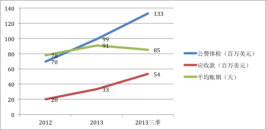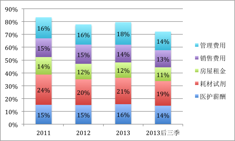 營(yíng)收成本中的房屋租金及管理費(fèi)用、銷售費(fèi)用是與體檢人數(shù)沒有直接關(guān)系的固定成本,三項(xiàng)合計(jì)相當(dāng)于營(yíng)收的38%(2013財(cái)年)。增加體檢接待人數(shù),是提高業(yè)績(jī)的最佳手段。