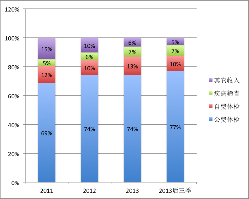體檢分為來自公司客戶的公費(fèi)體檢和個(gè)人自費(fèi)體檢;疾病篩查是針對(duì)體檢中發(fā)現(xiàn)疑點(diǎn)的進(jìn)一步檢測(cè),是體檢的副產(chǎn)品;其它服務(wù)也是面向公司各戶的。算下來,只有10%的營(yíng)收來自個(gè)人體檢。
