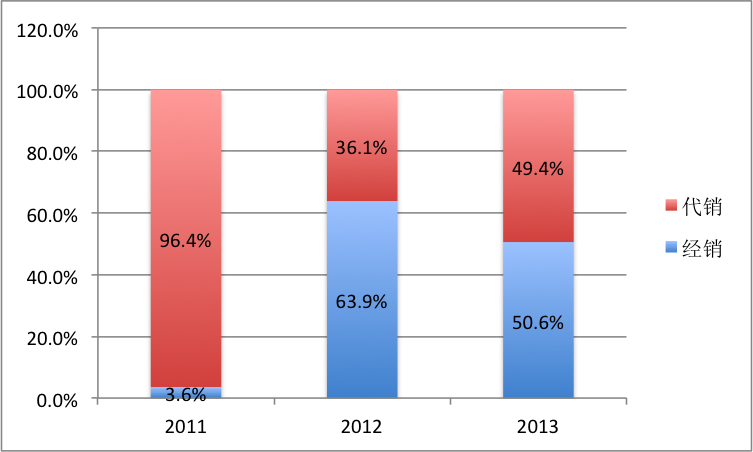 2011年聚美優(yōu)品上96.4%的產(chǎn)品是代銷。這十分符合聚美優(yōu)品當(dāng)年的情況,代銷沒有資金和庫(kù)存壓力,法律風(fēng)險(xiǎn)較小,但一般情況下費(fèi)率很低。2011年,京東代銷傭金費(fèi)率只有2.04%,聚美優(yōu)品則為20.8%!