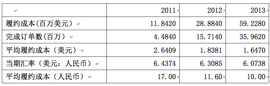 把一大堆數(shù)字加起來才能算出履約費(fèi)用,乘以當(dāng)年的美元兌換人民幣的匯率,再除以3596.2萬張訂單(以2013年為例)居然就是10.00元人民幣。再往前年,2012年、2011年每張訂單的履約成本分別是11.60元、17.00元,一分不多一分不少,這樣漂亮整齊的數(shù)字只能是編的!