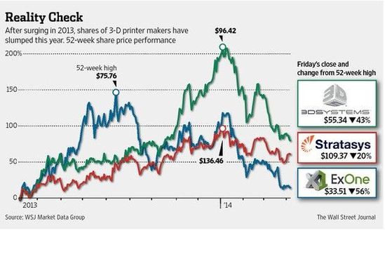 3D打印類股票今年開局艱難,兩家行業(yè)領(lǐng)先公司3D Systems和Stratasys分別大挫40%和19%。不過仍有部分3D打印公司的前瞻市盈率維持在50倍到70倍的高位。3D打印公司ExOne總裁大衛(wèi)·伯恩斯(David Burns)和火熱的3D打印行業(yè)面臨的其中一項艱巨任務(wù)是控制期望值,包括控制他自己的期望值。去年,伯恩斯預計ExOne營收將實現(xiàn)80%的增長。到了今年2月,ExOne稱公司的銷售額增長仍然強勁,但由于遞延訂單的影響,將只有原來預期的一半。ExOne股價此后大跌了46%。