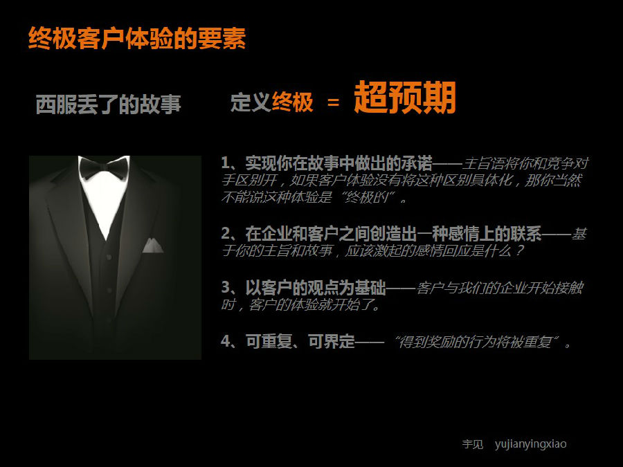 結(jié)果,出乎意料,回復(fù)不再是“不確定”、“不好說”,而是很明確地告訴他:“在您開車趕來的路上,就能準備好需要的西服?!丙溈藙P恩將信將疑趕過去,結(jié)果又大大出乎意料:男裝店不僅準備好了西服,還考慮到他襯衫的不同顏色準備了藏青和炭黑兩套供挑選,而他一開始試穿,裁縫就開始修改褲子,一分鐘也沒耽誤,不僅讓他如期完成了演講,更完全超越了他的預(yù)期……