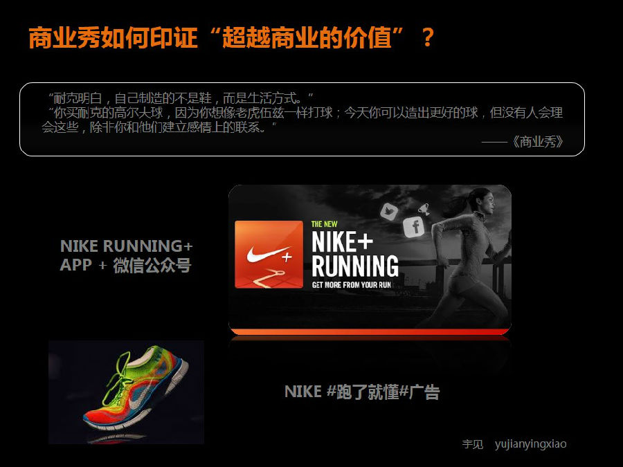 我最近關(guān)注Nike Running+的APP包括微信號,發(fā)現(xiàn)他們不是在賣鞋,而是組織各種跑步活動,給你一些健身的信息,輔助你的運動,給你提供服務(wù),應(yīng)該說,這種新的信息交互方式在幫助Nike更好地去創(chuàng)造那個“超出商業(yè)”的一點點,所以對這件事情的理解上,雖然說技術(shù)在變,信息交互方式在變,媒體環(huán)境在變,但耐克一直“初心未變”。