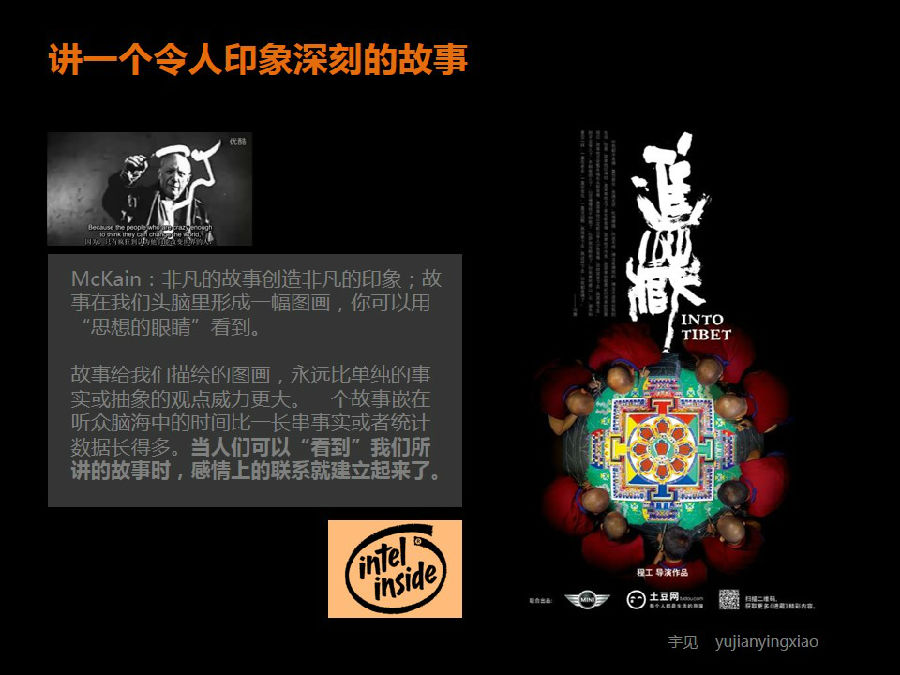 麥克凱恩:“非凡的故事創(chuàng)造非凡的印象;故事在我們頭腦里形成一幅圖畫,你可以用‘思想的眼睛’看到。故事給我們描繪的圖畫,永遠比單純的事實或抽象的觀點威力更大。一個故事嵌在聽眾腦海中的時間比一長串事實或者統(tǒng)計數(shù)據(jù)長得多。當人們可以‘看到’我們所講的故事時,感情上的聯(lián)系就建立起來了?!?/span>