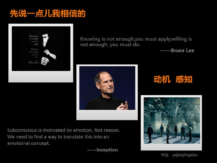 和李小龍一樣,在我眼中喬布斯也是一個“東方人”?!秵滩妓箓鳌酚涗浟怂浅V匾曌鲆患虑榈摹皠訖C”,今天所講的“初心”,另外重視發(fā)展自己的“感知”能力,這和今天的主題有一定關(guān)聯(lián)。