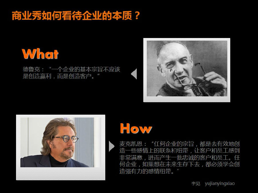 德魯克回答了一個“是與非”的問題,說的是“What”,麥克凱恩在書里進一步給出了“How”;OK你說企業(yè)的宗旨是創(chuàng)造客戶,那怎么創(chuàng)造?