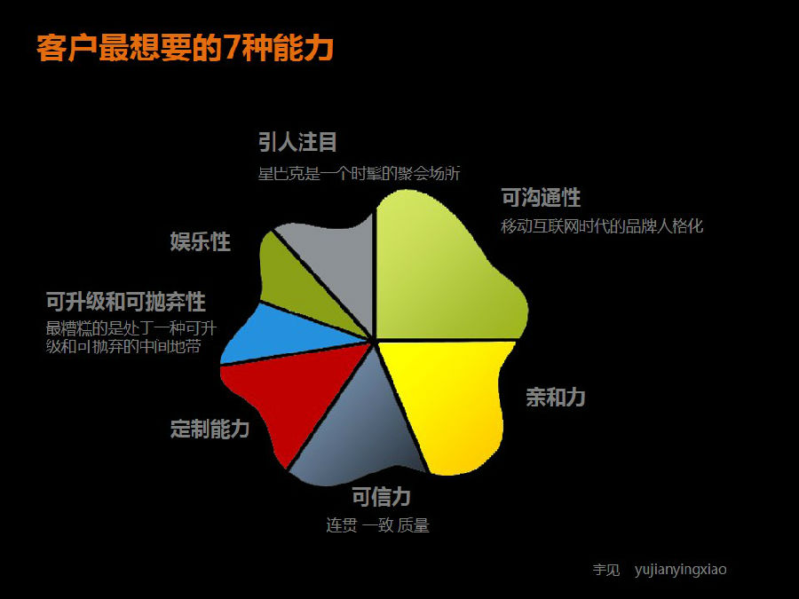 最后一頁是《商業(yè)秀》列出的客戶最想要的7種能力。排在第一位的是右上角的“可溝通性”;尤其在移動互聯(lián)網(wǎng)時代,對一個品牌就像對一個人一樣,用戶現(xiàn)在更加期待和它做直接的、點對點的、即時的溝通,這要求你要有很好的重視和“接納”能力,透過新媒體加強你的可溝通性,不能罔顧用戶的這種需要。