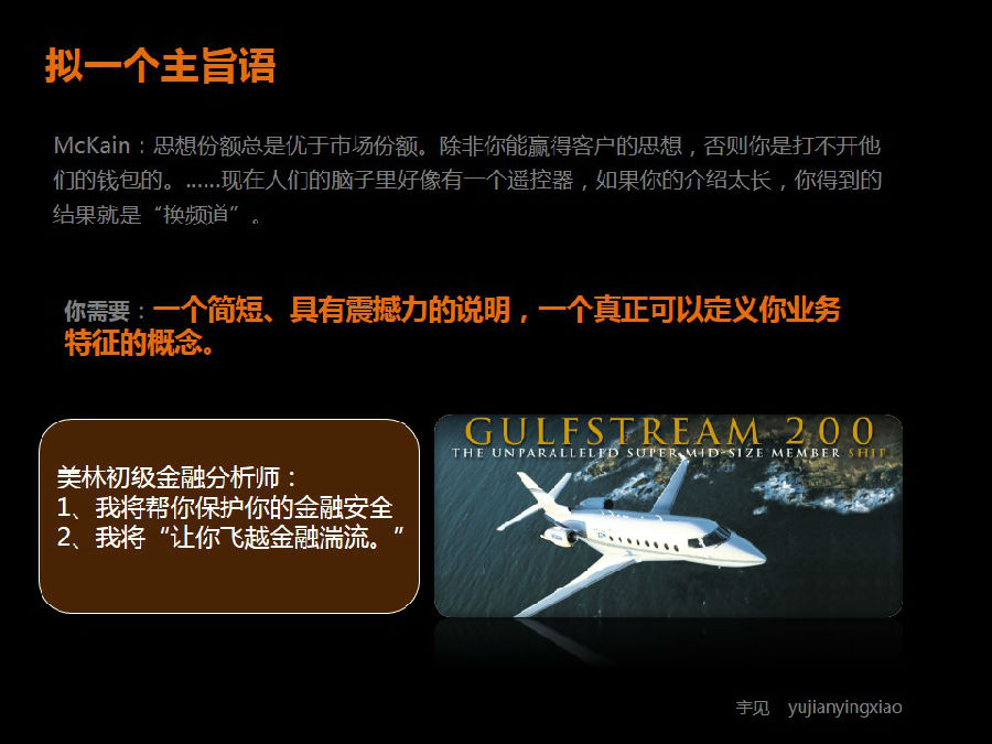 后來他們聊天得知,這哥們在做金融分析師之前是個飛行員,于是想到了這樣一句主旨語:“我將帶你飛越金融的湍流?!笔潞筮@個金融分析師興奮地告訴麥克凱恩說,他的業(yè)務(wù)量增長明顯,現(xiàn)在客戶打電話來說,我要找那個能“飛越金融湍流”的家伙,就找到他了,用今天的話說,增加了你的品牌識辨度。