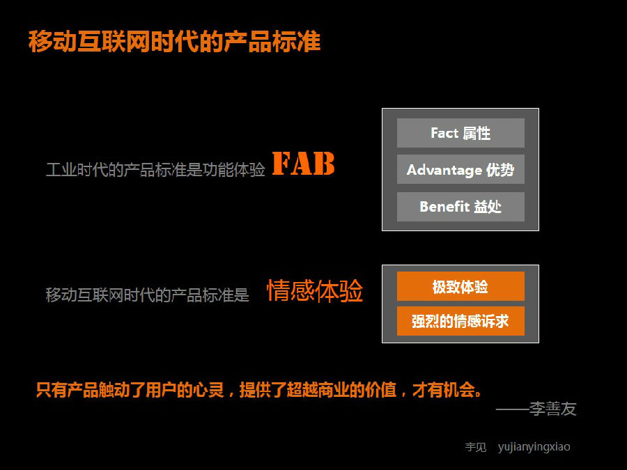 工業(yè)時代的產(chǎn)品標準是功能體驗,主要強調(diào)功能功效,簡稱FAB;先跟你講Fact、屬性,這產(chǎn)品有什么不一樣的功能;然后是Advantage、優(yōu)勢,我比別人如何;第三Benefit,益處,你用了會怎樣怎樣,大概都沿襲這個套路,但今天用戶還理會這些嗎?
