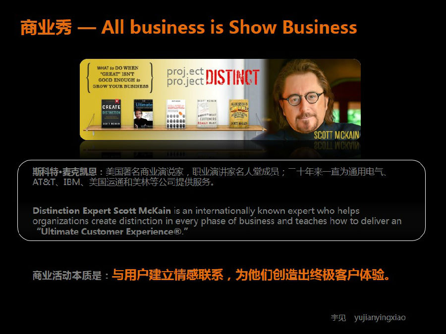 作者斯科特?麥克凱恩,是美國著名的商業(yè)演講家,二十年來一直在為一系列牛X的大公司服務(wù)。國外的介紹更有趣,說這位“Distinction Expert”,怎么翻譯?區(qū)別創(chuàng)造專家?“這位國際知名的專家一直幫助企業(yè)在他們商業(yè)的每一個方面創(chuàng)造不同,并且教企業(yè)如何去創(chuàng)造‘終極客戶體驗’”。