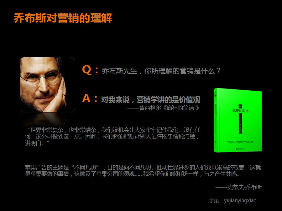 在內(nèi)部會議上喬布斯說,“對我來講,營銷學(xué)講的是價值觀”;這句話非常重要,喬布斯給出的答案非常直接,非常干凈,非常純粹,甚至不是說營銷是傳播價值觀,是營銷就是價值觀。