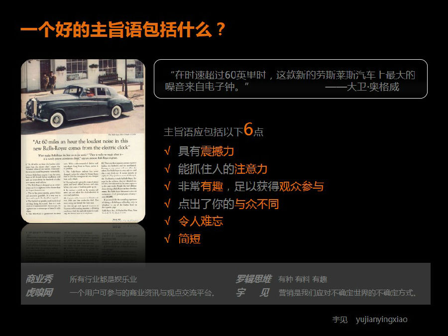 奧格威作為奧美的創(chuàng)始人,廣告業(yè)的曠世奇才,創(chuàng)作過一個經(jīng)典長句,為勞斯萊斯寫的廣告語:“在時速超過60英里時,這款新的勞斯萊斯汽車上最大的噪音來自電子鐘?!?/div>
