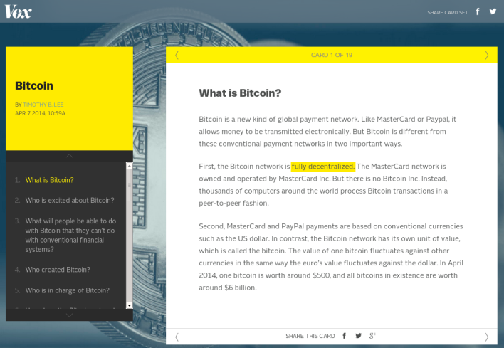 “卡片”設(shè)計(jì):Vox 和常規(guī)新聞網(wǎng)站相比最顯而易見的區(qū)別就是 Vox 稱之為“卡片”的功能,即有關(guān)某一話題的一小段信息摘述,其中的鏈接使用黃色高亮背景。從某種意義上來說,和這一功能類似的是傳統(tǒng)媒體使用的“話題頁”,比如《紐約時(shí)報(bào)》網(wǎng)站會(huì)在站內(nèi)加這種鏈接,但是 Vox 的版本更短小精煉,也多少有點(diǎn)話題性。