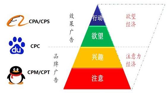 上圖是被倒過來的漏洞。漏斗越到底部轉(zhuǎn)化率越高。阿里在欲望和行動之間,百度在興趣和欲望之間,騰訊則在漏洞頂部。