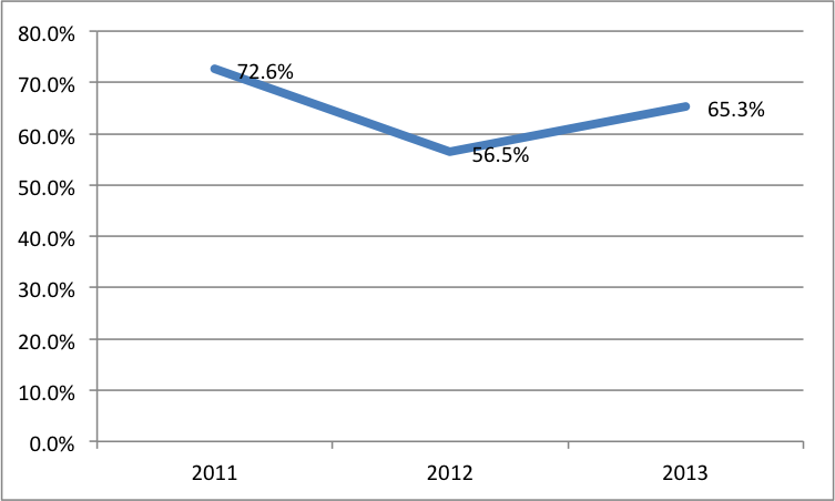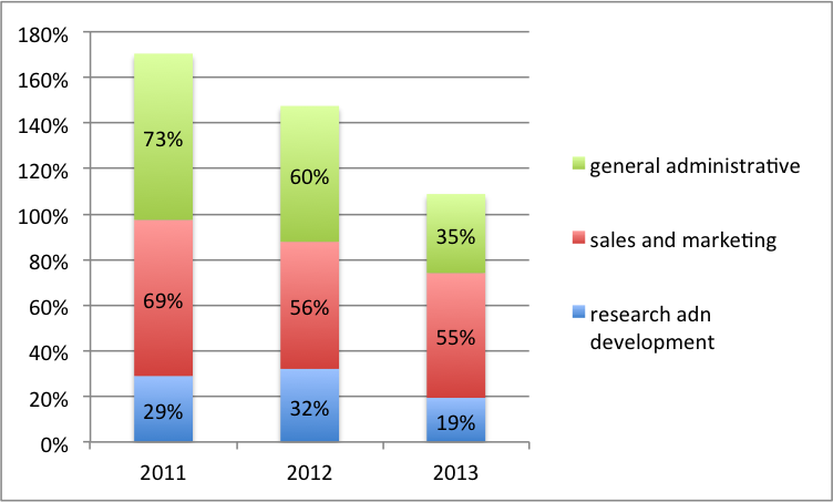首先是獲取流量并將之轉(zhuǎn)化為營收的效率不夠高。2013年市場費(fèi)用超過1.1億,而還原后的凈營收僅有2.01億。
