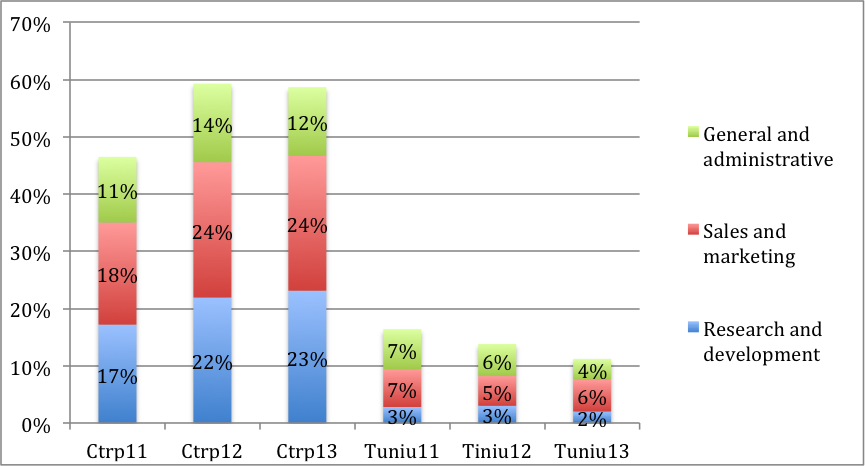 為什么說途牛網(wǎng)的包裝弄巧成拙呢?首先,它扭曲了所有的財(cái)務(wù)數(shù)據(jù)。比如營收結(jié)構(gòu),令人感覺途牛網(wǎng)跟團(tuán)游以外的產(chǎn)品不過聊勝于無。再比如費(fèi)用結(jié)構(gòu),下圖是與攜程的比較。