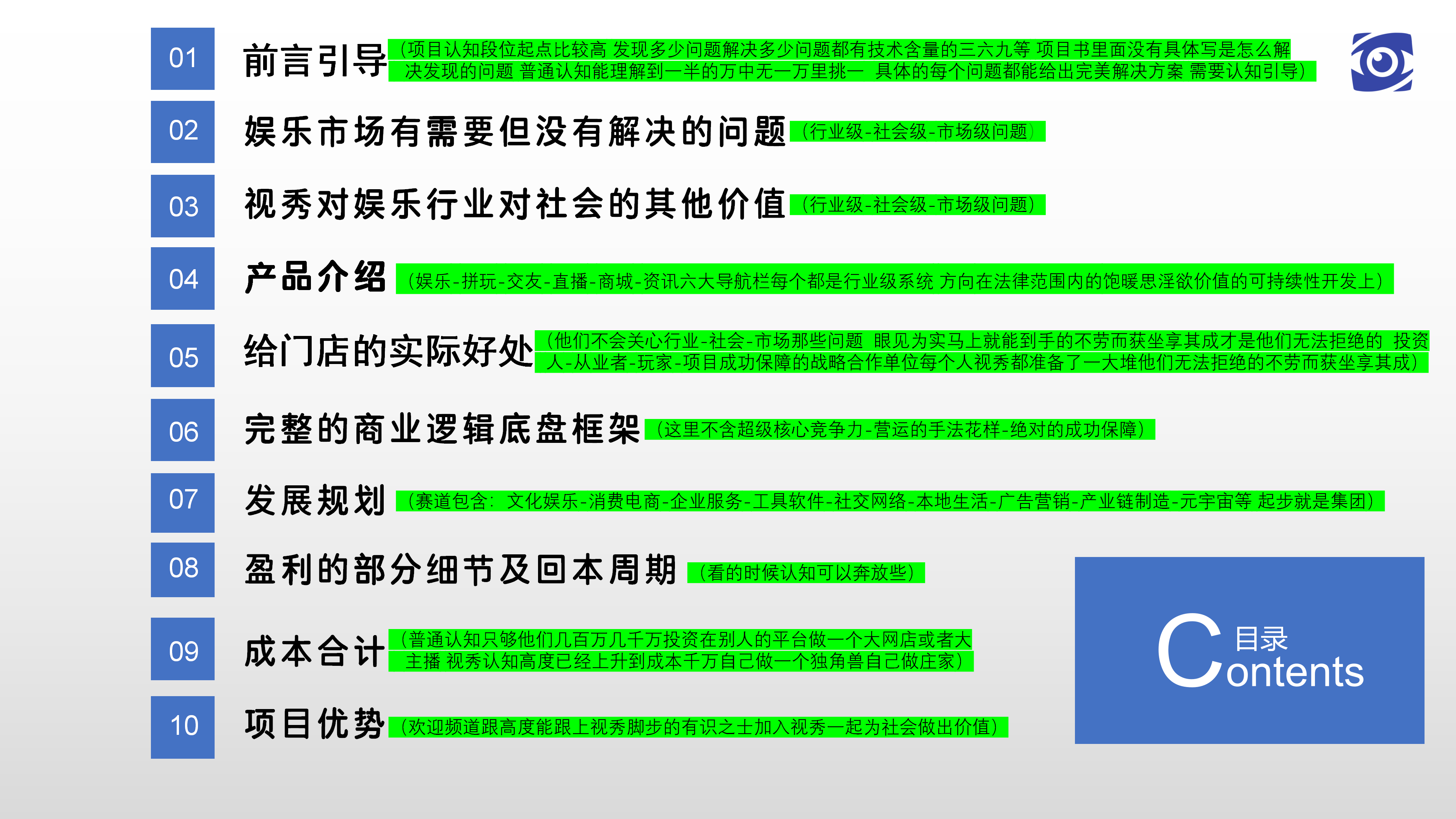 市面平臺都是粘性商戶(視秀一站式解決領(lǐng)域內(nèi)商戶一切問題)跟用戶(視秀一站式解決領(lǐng)域內(nèi)用戶一切問題) 但視秀也會(huì)粘性從業(yè)者(1沖著人消費(fèi)2場所營銷3讓利及賦能高管) 成功的保障之一更是會(huì)粘性捆綁大量領(lǐng)域內(nèi)有商戶資源量的各種供應(yīng)商單位 供應(yīng)商單位除了快速大批量裂變視秀商戶 也是視秀領(lǐng)域內(nèi)免費(fèi)有價(jià)值的宣傳-對接-成交工具(避免沒用的廣告-地推-補(bǔ)貼燒錢) 項(xiàng)目書目錄第五條應(yīng)用的是前言引導(dǎo)的第二條 同樣的戰(zhàn)略合作單位創(chuàng)始人也給他們準(zhǔn)備了一堆視秀(成本忽略不計(jì))在不增加他們投資費(fèi)用跟營運(yùn)成本基礎(chǔ)之上給他們眼見為實(shí)的-馬上就能到手的-不勞而獲的-坐享其成的讓他們無法拒絕  商戶-從業(yè)者-玩家-戰(zhàn)略合作單位所能看見的利全部讓給他們 商戶-高管-戰(zhàn)略合作單位三者形成完美閉環(huán)他們自己就會(huì)瘋狂裂變海量視秀商戶 對于商戶來說視秀提供的是免費(fèi)的企業(yè)服務(wù)(收銀管理系統(tǒng)-夜場霸屏經(jīng)營系統(tǒng)-營銷系統(tǒng)) 每張消費(fèi)桌跟場內(nèi)所有屏幕上都是視秀對商戶企業(yè)服務(wù)的二維碼(類似掃碼點(diǎn)單 但視秀的聯(lián)合操作打組合拳花樣更多) 門店消費(fèi)者自己就會(huì)潛移默化成視秀的注冊用戶了