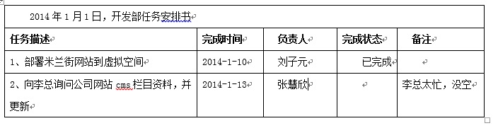 每一項重要的工作,部門會有一份任務(wù)安排書。重點描述工作的時間,任務(wù)描述,主要負(fù)責(zé)人,完成狀態(tài)等信息。例如: