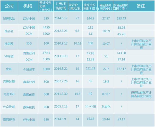 以回報(bào)率來看,58同城再次”奪魁“。在58同城2010年5月和12月的C輪及D輪融資中,DCM總投資金額1500萬美元。3年后,2013年10月31日,58同城成功IPO,發(fā)行價(jià)17美元,DCM賬面回報(bào)倍數(shù)達(dá)到12.38倍。如今58同城股價(jià)已經(jīng)到51美元(截至發(fā)稿時(shí)),DCM如果沒有退出則賬面回報(bào)已經(jīng)達(dá)到37.14倍。