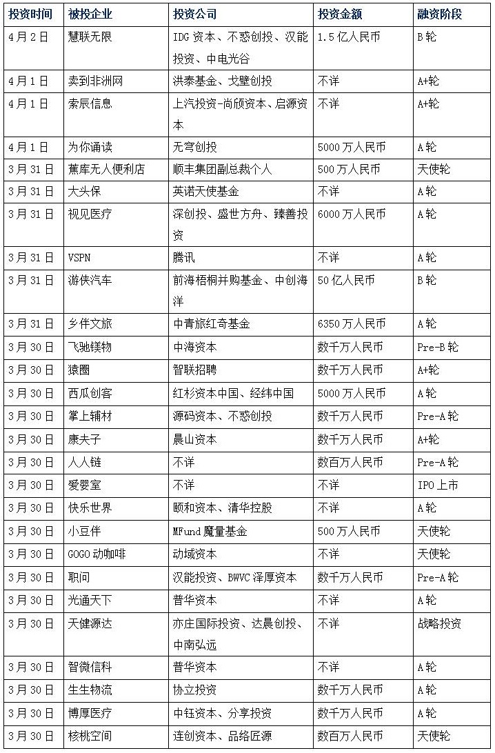 今日創(chuàng)投:慧聯(lián)無限獲B輪融資,中電光谷參投;博厚醫(yī)療獲千萬投資,加快布局基層診療;核桃空間獲天使融資,用于移動(dòng)店鋪擴(kuò)張